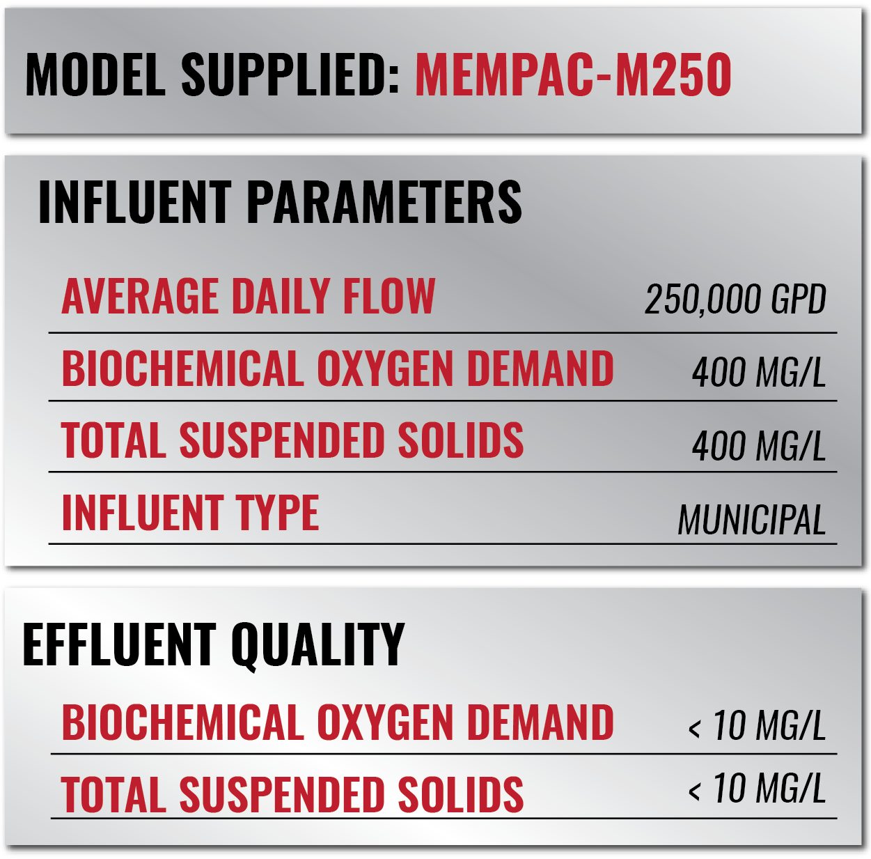 This was a phased project capable of treating up to 1.5 MGD comprised of three separate .5 MGD package wastewater treatment plants. This project was a design/build effort with Fluid Resource Management (FRM) and other sub-contractors. Cloacina's scope included providing a lift station, Mempac-M250 package treatment plant with UV disinfection and a DRYPAC Aerated Sludge Handling System, all with a fully integrated controls system including remote monitoring and alarming.