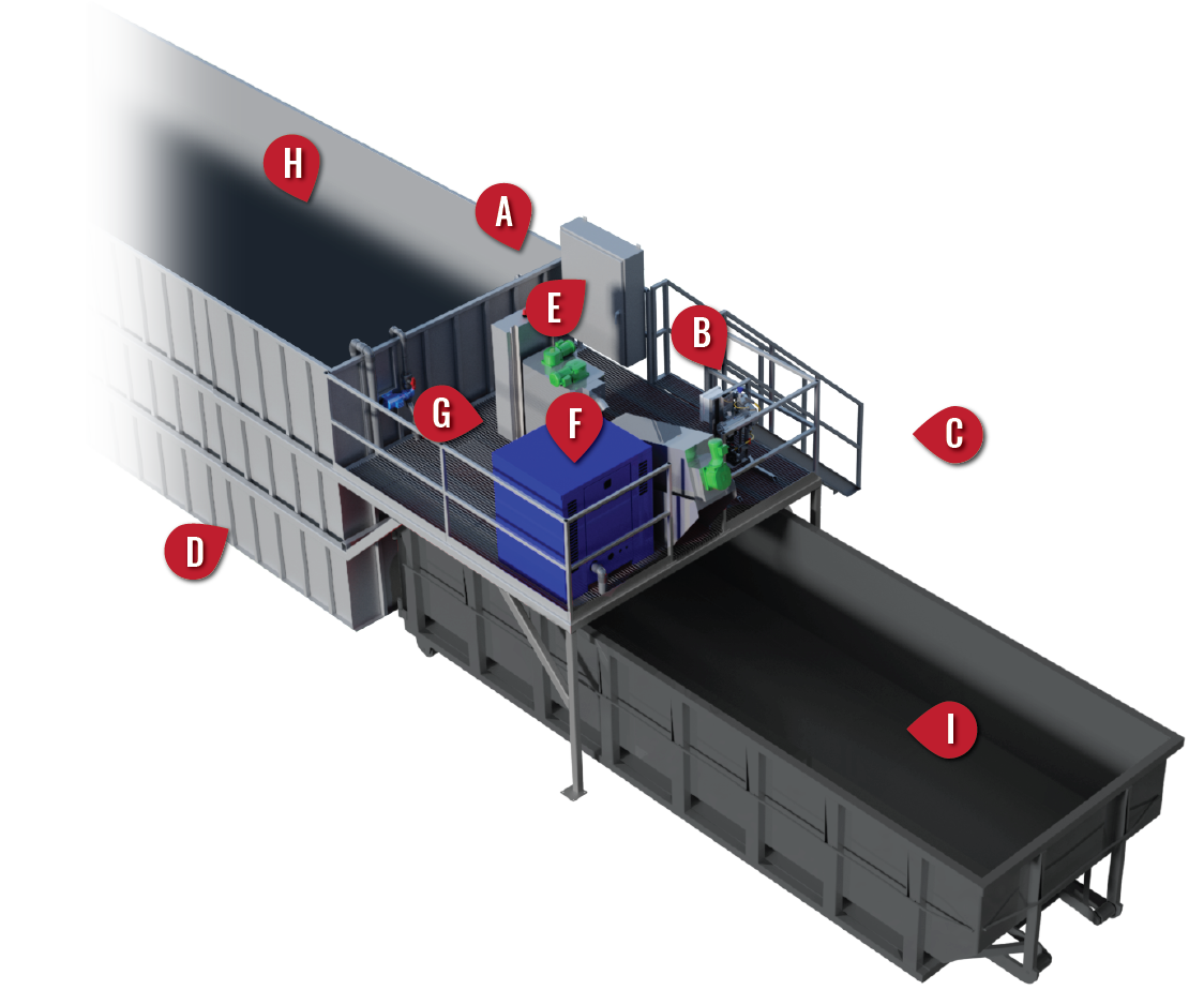 For dewatering, operators initiate the system manually to configure appropriate settings, after which it functions with automated safeguards to prevent operational issues, including shutdowns for low sludge levels or equipment malfunctions. Pressate from the dewatering process is directed back to the plant’s headworks or to an established disposal area, while dewatered solids are deposited into a client-provided container, such as a dumpster, roll-off, or custom bin.
